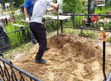 Первым делом мы подготовили участок к работам: демонтировали уже установленное надгробье, а также разровняли почву на могиле, тем самым подготовив её к укладке наземного покрытия.