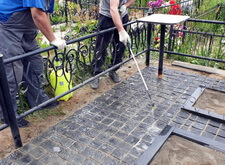 В заключении укладываем на территорию участка брусчатку, предварительно застелив место захоронения геотекстилем. Уложенные в периметр могилы плитки засыпаем пескобетонной смесь, позволяющей наиболее эффективно закрепить покрытие на земле.
