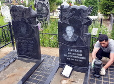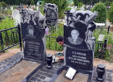 Памятник аккуратнейшим образом крепим на подставку, к которой пристраиваем цветник. Ту же операцию повторяем и со вторым надгробьем. Памятники выставляем строго на одной линии, параллель, а также горизонталь цветников проверяем с помощью уровня. Чёткая установка исключает не только наличие визуальных дефектов, но и имеет практическое значение: поставленный «как надо» памятник в дальнейшем не завалится на бок, а благодаря обкладке брусчаткой и не просядет вниз.