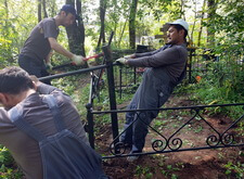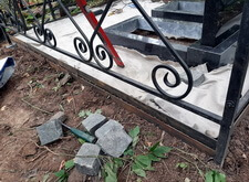 Когда памятники были готовы, мы приступили к работам на участке. В первую очередь мы очистили могилу от сорной травы, а затем вкрутили сваи, которые в дальнейшем будут опорами для памятников.