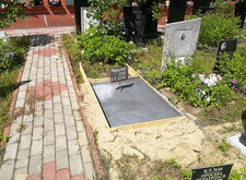 На него установили цветник и подставку для памятника. Борта цветника накрыли стоявшей ранее на участке гранитной доской, предварительно её отполировав и добавив гравировки. Получившаяся надгробная плита выглядит довольно-таки презентабельно.