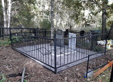 Клиент заказал достаточно экономное покрытие серой гранитной крошкой. Для того, чтобы трава в дальнейшем не прорастала, мы затянули территорию места захоронения (а также пространство внутри цветников) геотекстилем. Параллельно с этим по периметру участка установили железную полосу, препятствующую выпадению крошки за территорию могилы.