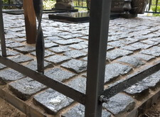 Переходим к завершающему этапу работы. Переустанавливаем уже стоящий памятник, немного его приподнимая, и закладываем территорию участка гранитной брусчаткой.